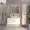 Подвесная тумба под накладную раковину – современное минималистичное решение для ванной. Плавные скругленные края, белый фасад с древесным корпусом символизируют гармонию, создают ощущение легкости и безопасности. Это особенно актуально в ванной комнате, где важно чувствовать себя комфортно и расслабленно.