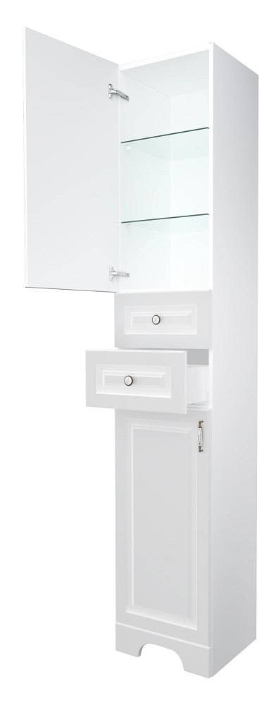 Пенал, который способен решить все основные задачи по компактному и удобному хранению в ванной комнате косметики, личных вещей, банных принадлежностей и бытовой химии. Вместительный и невероятно удобный, он оснащен двумя отделениями с полками и двумя выдвижными ящиками, поэтому успешно воплощает идею "все в одном месте". Его прочный и надежный фасад выполнен из МДФ и дополнительно покрыт пленкой ПВХ, обеспечивающей необходимую защиту от воздействия влаги, а поистине классический лаконичный дизайн делает пенал подходящим для любого интерьера - от традиционного до современного.Характеристики: