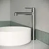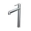 Стильный высокий смеситель для настольного умывальника удачно сочетает актуальный современный дизайн и новый трендовый оттенок матового хрома с брашированным покрытием. Тонкая удлиненная ручка добавляет смесителю изящества и комфорт в управлении. Расстояние между ручкой и изливом увеличено для большего удобства.