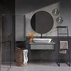 Столешница из керамогранита - это стильное, функциональное и долговечное решение, которое подойдет для ванных комнат, исполненных в самых разнообразных отделочных материалах. Такая универсальность, тем не менее, предполагает высокую декоративную и эстетическую ценность столешницы - она делает обстановку в ванной комнате по-настоящему стильной и соответствующей актуальным тенденциям в дизайне. Металлическое подстолье создает эффектный цветовой контраст, а также может использоваться в качестве практичных рейлингов для удобного размещения полотенец и банных халатов.
